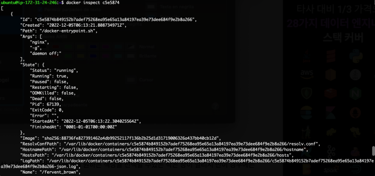 - docker ps 명령어는 실행중인 컨테이너의 상태를 확인할 수 있습니다.