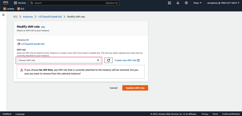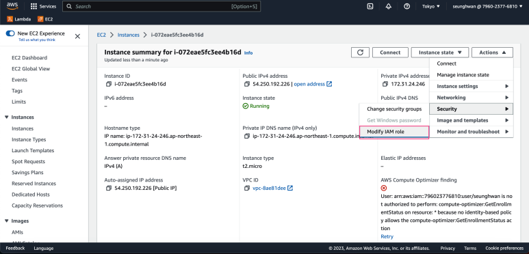 실행중인 EC2 인스턴스 아이디를 클릭해 접속한 후, [Actions] -> [Security] -> [Modify IAM role]을 클릭합니다.
