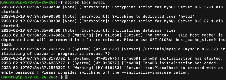 mysql과 같은 어플리케이션을 구동하는 컨테이너는 포그라운드 모드로 실행이 되므로 -d 옵션을 써서 백그라운드 모드로 컨테이너를 생성하는 경우가 많습니다. 따라서 어플리케이션이 잘 구동되는지 여부를 알 수는 없지만 docker logs 명령어를 써서 컨테이너의 표준 출력을 확인함으로써 어플리케이션의 상태를 알 수 있습니다.