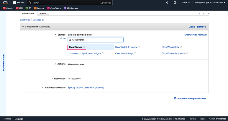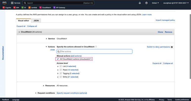 그리고 아까 생성하였던 CloudWatch에 대한 권한을 추가해줍니다.