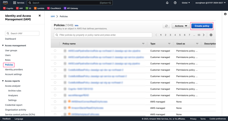 먼저, [Security, Identity & Compliance] -> [IAM] -> [Policies]에 들어가줍니다.
