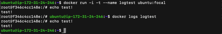docker logs 명령어는 run 명령어에서 -i -t 옵션을 설정해 docker attach 명령어를 사용할 수 있는 컨테이너에도 사용할 수 있으며, 컨테이너 내부에서 bash 쉘 등을 입출력한 내용을 확인할 수 있습니다.