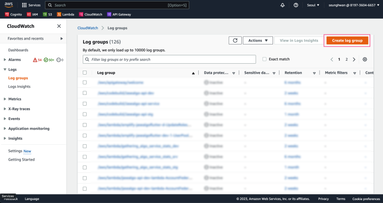 Create log group 클릭하고 로그 그룹을 생성해줍니다.