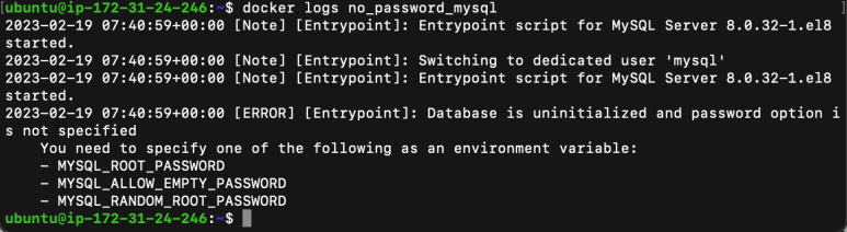 위 명령어를 실행한 뒤 docker ps 명령어로 컨테이너의 목록을 확인하면 no_password_mysql 컨테이너는 생성이 되었으나 실행이 되지 않았습니다. 내부적으로 오류가 있기 때문입니다.