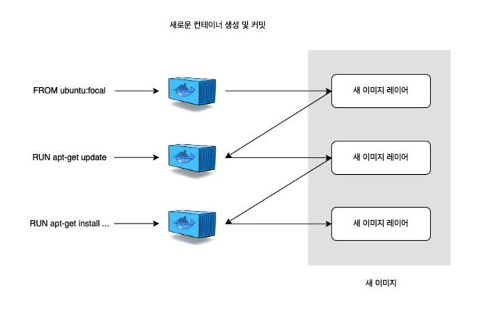 각 Step은 Dockerfile에 기록된 명령어에 해당합니다. FROM, RUN, WORKDIR 등의 명령어가 실행될 때마다 새로운 컨테이너가 하나씩 생성되며 이를 이미지로 커밋 합니다. 즉, Dockerfile에서 명령어 한 줄이 실행될 때마다 이전 Step에서 생성된 이미지에 의해 새로운 컨테이너가 생성되며, Dockerfile에 적힌 명령어를 수행하고 다시 새로운 이미지 레이어로 저장됩니다.