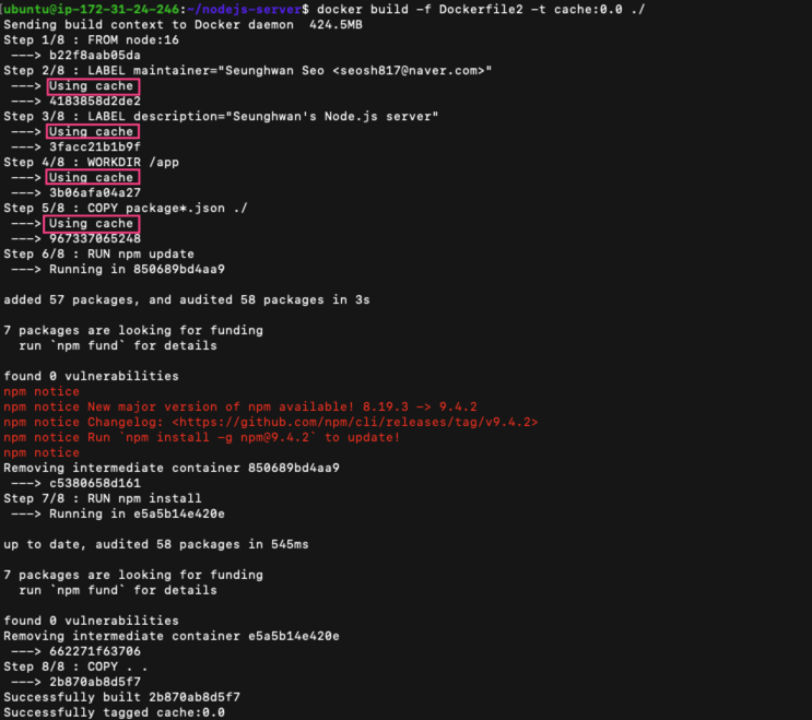 Dockerfile의 이름을 Dockerfile2로 저장했습니다. docker build 명령어의 -f(-file) 옵션으로 Dockerfile의 이름을 지정할 수 있습니다. 그래서, docker build 명령어를 docker build -f Dockerfile2 -t cache:0.0 ./ 로 입력해 Dockerfile2를 빌드 해주겠습니다.