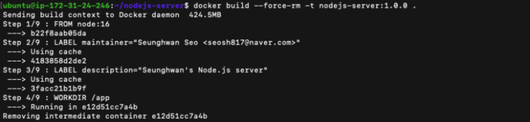 --force-rm 옵션 -> 중간중간에 생성되는 임시 컨테이너를 제거합니다.