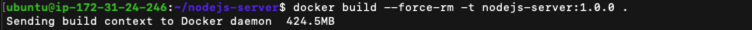 빌드를 시작하면 위와 같은 내용이 출력되며 nodejs-server:1.0.0이라는 이름의 이미지가 생성됩니다. 컨테이너가 실행될 때 CMD에서 'node server.js' 명령어로 노드 JS 서버를 실행하도록 설정했기 때문에 컨테이너를 실행하면 노드 JS 서버가 실행됩니다.