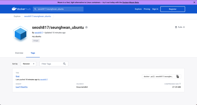 저장소가 생성이 되었고 저장소의 이름은 [계정 이름/이미지 이름] 형식이므로 seosh817/seunghwan_ubuntu로 생성이 되었습니다.