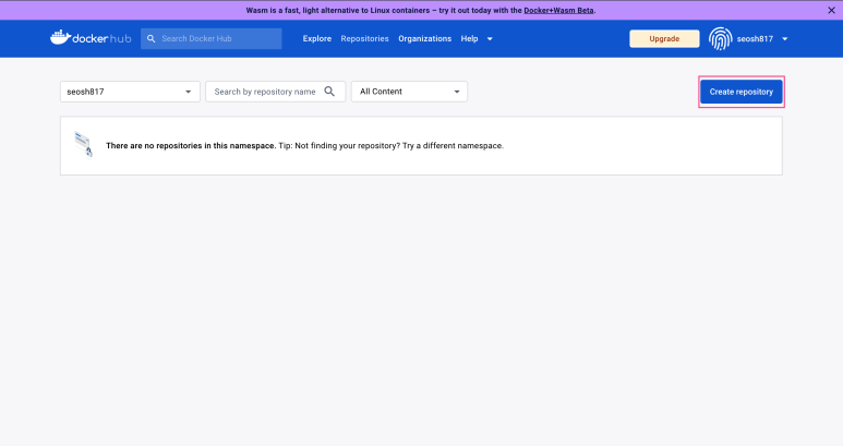 로그인 후에 [Repositories] -> [Create Repository]를 클릭합니다.