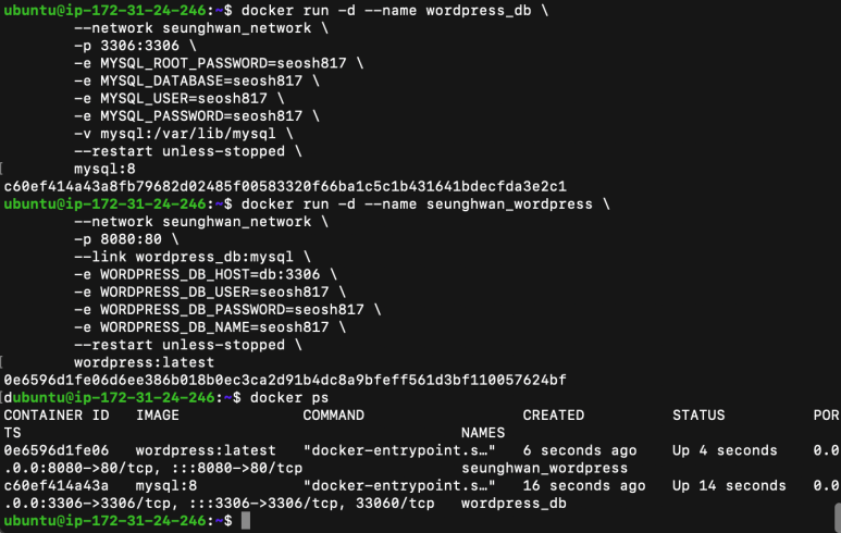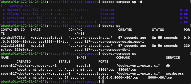 docker ps 명령어로 mysql과 wordpress 컨테이너가 docker-compose.yml에 명시된대로 생성된 것을 확인할 수 있습니다.