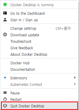 - 리눅스는 위 명령어로 도커 엔진를 종료시키고, 윈도우 도커 데스크탑은 태스크 트레이에서 도커 데스크톱을 마우스 우클릭 후에 Quit Docker Desktop을 선택하면 엔진이 종료된다.