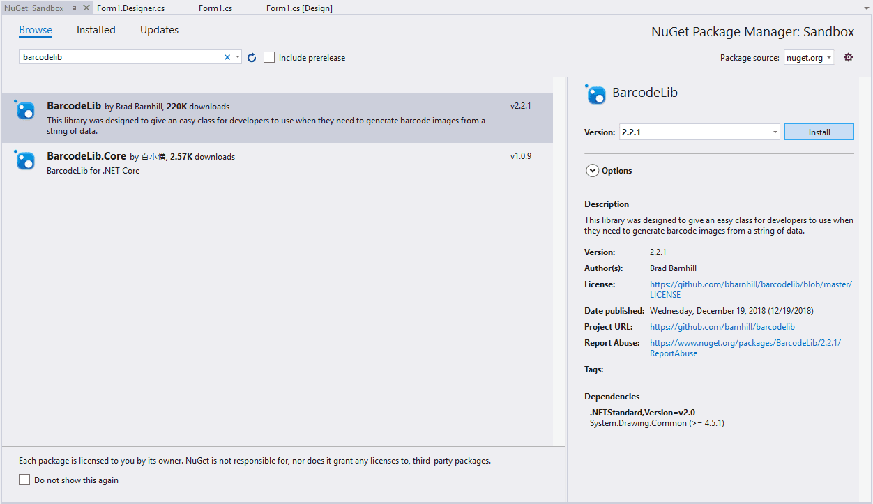 Select the first package by Brad Barnhill and install it in your project. Once the installation finishes you will be able to use the library to create barcode images on your code. For more information about this library, please visit the official repository at Github here. After installing the library in your project, you will be able to import the barcode library namespace and the image classes of .NET: