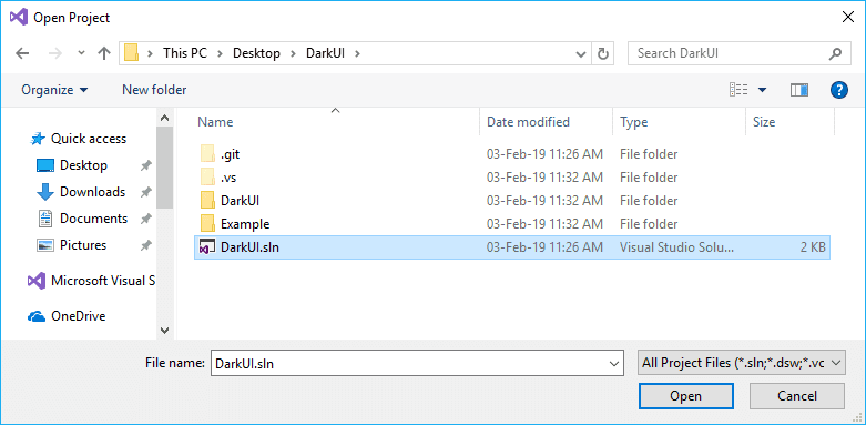 This will contain 2 directories of the project and a solution file, this will allow you to open the DarkUI project from Visual Studio: