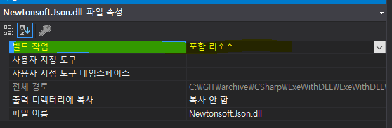 5. Newtonsoft.Json.dll 속성 -> 빌드 작업 -> 포함 리소스로 변경해 줍니다.