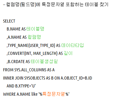SELECT B.NAME AS TABLE_NM, A.NAME AS COL_NM FROM SYS.ALL_COLUMNS AS A INNER JOIN SYSOBJECTS AS B ON A.OBJECT_ID = B.ID AND B.XTYPE='U' WHERE A.NAME LIKE '찾을 컬럼명%'
