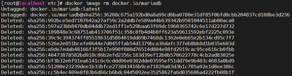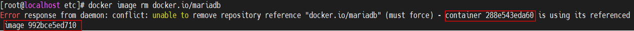 -> 이미지 mariadb를 삭제하려고 할 때 이미지를 참조 중이여서 발생하는 에러이다. 컨네이너ID가, 이미지ID를 참조중