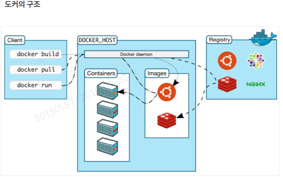 - 도커 이미지 : 도커 컨테이너를 구성하는 파일 시스템과 실행할 애플리케이션 설정을 하나로 합친 것으로, 컨테이너를 생성하는 템플릿 역할을 한다.