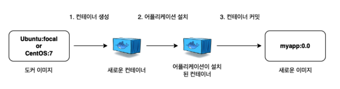 도커는 위와 같은 일련의 과정을 손쉽게 기록하고 수행할 수 있는 docker build 명령어를 제공합니다. 완성된 이미지를 생성하기 위해 컨테이너에 설치해야 하는 패키지, 추가해야 하는 소스코드, 실행해야 하는 명령어와 쉘 스크립트 등을 하나의 파일에 기록해두면, 도커는 이 파일을 읽어서 컨테이너에서 작업을 수행한 뒤 이미지로 만듭니다.